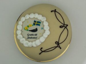 Studenttårta med oblat 5-7 bitar GRÄDDE, socker, vatten, ÄGG, MANDEL, VETEMJÖL, VETESTÄRKELSE, hallon, KÄRNMJÖLKSPULVER, vegetabiliskt fett (kokos), glukossirap, invertsirap, förtjockningsmedel (E440, E1442, E414, E460), emulgeringsmedel (E472e, E471, E475), glycerol, konserveringsmedel (E202, E211), bakpulver(E450, E500, VETEstärkelse, E170), aromer, salt, majsstärkelse, färgämnen (E160a, E101, E171), majssirap, fast majssirap, sötningsmedel (E420), VASSLEPULVER, enzym, antioxidationsmedel (E330, E331, E333), glycerin, polysorbat 80, vegetabilisk olja, vanilj | Prinsesstårta med naturell marsipan. Sockerkaksbotten, hallonsylt, vaniljkräm och grädde, oblat med studentmotiv och smörkräm.Denna tårta skriver vi ej text på | 189 kr | ||
