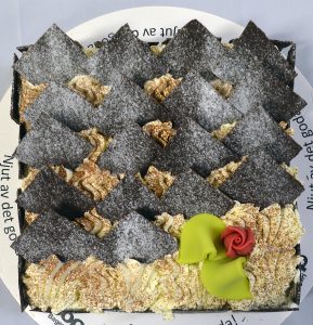 Smörgåstårta Skinka/Kalkon Ost/skinkröra(Rapsolja, alspånsrökt skinka (skinka, vatten, salt, druvsocker, stabiliseringsmedel (natriumdifosfat), konserveringsmedel (natriumnitrit)), äpple, vatten, lök, ÄGGULA, SENAPSFRÖ, opastöriserad HÅRDOST , OSTPULVER, ättika, gräslök, socker, salt, libbsticka, kryddor, stabiliseringsmedel (guarkärnmjöl, xantangummi), surhetsreglerande medel (citronsyra), konserveringsmedel (natriumbensoat, kaliumsorbat), arom (skinka, rök)), Mimosasallad (Frukt (persika, päron, ananas, äpple ), rapsolja, vatten, ÄGGULA, socker, SENAPSFRÖ, salt, kryddor, ättika, modifierad stärkelse, glukossirap (av majs), stabiliseringsmedel (guarkärnmjöl, xantangummi), surhetsreglerande medel (citronsyra), konserveringsmedel (natriumbensoat, kaliumsorbat)), VETEMJÖL, vatten, MAYOFRAICHE(Svensk pressad rapsolja, crème fraiche (GRÄDDE, syrningskultur), vatten, ÄGG, socker, vinäger, salt, konserveringsmedel (E 202), ättikssprit, surhetsreglerande medel (E 330), SENAPSFRÖ, stabiliseringsmedel (E 412, E 415), kryddor), Rökt Kyckling(Kycklingbröst, vatten, salt, maltodextrin, jästextrakt, stabiliseringsmedel (E450, E451), antioxidationsmedel (E331, E301), surhetsreglerandemedel (E500), konserveringsmedel (E250), rökarom), Ost 10g(KOMJÖLK, salt, syrningskultur, ystenzym), Skinka 10g(Skinkbitar, vatten, salt, maltodextrin, druvsocker, stabiliseringsmedel (451, E450, E407), antioxidationsmedel (E331, E301), Konserveringsmedel (E250), rökarom, tomat, apelsin, melon, Sallad, vindruvor, rapsolja, RÅGMJÖL, sirap, KORNMALT, salt, surdeg av RÅG, jästpulver, persilja, VETEGLUTEN | Lyxig variant på ljus botten med mimosasallad, ost & skinkröra och majonnäs/cream fraiche.Dekorerad med sallad, tomat, apelsin, melon, vindruvor, persilja, ost, rökt skinka och rökt kalkon. | 295 kr-799 kr | ||