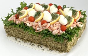 Smörgåstårta Räkor Skagenröra: (Rapsolja, SURIMI (vatten, FISK, socker, potatisstärkelse, ÄGGVITA, salt, KRABBAROM, färgämne (paprikaolerosin, karmin), surhetsreglerande medel (citronsyra)), RÄKOR 9g, vatten, ÄGGULA, LODDAROM, socker, ättika, SENAPSFRÖ, dill, salt, lök, citronkoncentrat, kryddor, stabiliseringsmedel (guarkärnmjöl, xantangummi, propylenglykolalginat), surhetsreglerande medel (mjölksyra, citronsyra), konserveringsmedel (natriumbensoat, kaliumsorbat), färgämne (riboflavin, karmin), RÄKOR, GURKSALLAD(Gurka 44, rapsolja, socker, ättika, vatten, ÄGGULA, SENAPSFRÖ, salt, lök, paprika, kryddor, modifierad stärkelse, stabiliseringsmedel (guarkärnmjöl, xantangummi), surhetsreglerande medel (citronsyra), konserveringsmedel (natriumbensoat, kaliumsorbat), färgämne (klorofyllkopparkomplex, riboflavin).), VETEMJÖL, vatten, MAYOFRAICHE(Svensk pressad rapsolja, crème fraiche (GRÄDDE, syrningskultur), vatten, ÄGG, socker, vinäger, salt, konserveringsmedel (E 202), ättikssprit, surhetsreglerande medel (E 330), SENAPSFRÖ, stabiliseringsmedel (E 412, E 415), kryddor), ÄGG, tomat, Sallad, citron, dill, Bakelsebotten(VETEMJÖL, vegetabiliskt fett (palm, raps) vatten, salt, emulgeringsmedel E471, surhetsreglerande medel E330, arom, MALTMJÖL av KORN, rapsolja, RÅGMJÖL, sirap, KORNMALT, salt, surdeg av RÅG, jästpulver, VETEGLUTEN. | Lyxig variant på ljus botten med skagenröra, gurksallad, majonnäs/cream fraiche. Dekorerad med sallad, tomat, citron, dill, ägg och handskalade räkor. | 295 kr-799 kr | ||