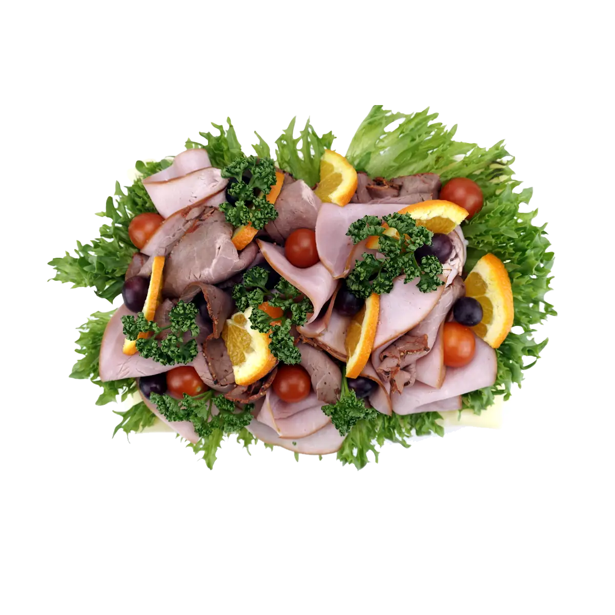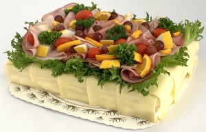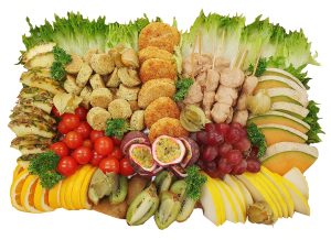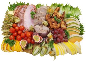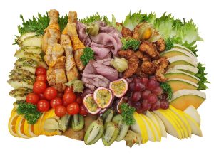 De levereras med exotiska frukter och man kan välja mellan potatissallad, potatisgratäng eller örtmarinerad pasta. Faten är perfekt bjudmat på student, födelsedagsfirande, bröllop, dop eller andra festliga tillfälle.
