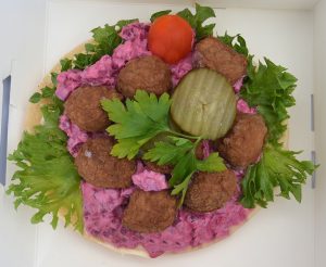 Bufféfat Nr 4 Vegetarisk med potatisgratäng Potatisgratäng(potatis, sås (vatten, skumMJÖLK, rapsolja, grädde (MJÖLK), ÄGGula från frigående höns inomhus, salt, socker, ostpulver (MJÖLK), modifierad majsstärkelse, aromer, druvsocker, stabiliseringsmedel: guarkärnmjöl och difosfater, kryddor, lökpulver, vitlökspulver, Sojaspett(Vatten, SOJAPROTEINPULVER, SOJABÖNMJÖL, socker, SOJABÖNOLJA, SOJASÅS (vatten, SOJABÖNOR, salt, VETE), potatismjöl, ingefära, salt, svartpepparextrakt, chilipulver, majsmjöl), Kikärt/Morotsbiff(Kikärt 56 %, morot 34 %, rismjöl, lök, kryddor (koriander, kummin, fänkål, citronskal), salt, jäsningsmedel (E500ii), rapsolja.), Falafelbulle (Kikärt 73 %, rapsolja, lök, rismjöl, persilja, koriander, salt, vitlök, kummin, jäsningsmedel (E500ii)), ananas, cantaloupe melon, melon, tomat, kiwi, apelsin, vindruvor, passionsfrukt, Sallad, physalis, persilja, | Bufféfat som består av Tzay spett, Falafelbulle samt Kikärt morotsbiff , potatisgratäng, frukt/grönsaker: ananas, melon (cantaloup och honungs), coctailtomater, vindruvor, kiwi, sallad,passionsfrukt, apelsin, physalis samt persiljaPris per portion 169:- |