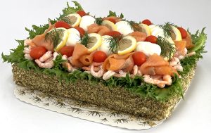 Smörgåstårta Lax & Räkor Skagenröra: Rapsolja, SURIMI 30 procent (vatten, FISK, socker, ÄGGVITA, potatisstärkelse, SOJAolja, salt, KRABBAROM, färgämne (paprikaextrakt, karmin)), RÄKOR 15 procent, vatten, ÄGGULA, LODDAROM, socker, ättika, SENAPSFRÖ, dill, salt, lök, citronkoncentrat, kryddor, stabiliseringsmedel (guarkärnmjöl, xantangummi, propylenglykolalginat), surhetsreglerande medel (mjölksyra, citronsyra), konserveringsmedel (natriumbensoat, kaliumsorbat), färgämne (riboflavin, karmin), RÄKOR(Handskalade), GURKSALLAD(Gurka 44, rapsolja, socker, ättika, vatten, ÄGGULA, SENAPSFRÖ, salt, lök, paprika, kryddor, modifierad stärkelse, stabiliseringsmedel (guarkärnmjöl, xantangummi), surhetsreglerande medel (citronsyra), konserveringsmedel (natriumbensoat, kaliumsorbat), färgämne (klorofyllkopparkomplex, riboflavin).), VETEMJÖL, MAYOFRAICHE(Svensk pressad rapsolja, crème fraiche (GRÄDDE, syrningskultur), vatten, ÄGG, socker, vinäger, salt, konserveringsmedel (E 202), ättikssprit, surhetsreglerande medel (E 330), SENAPSFRÖ, stabiliseringsmedel (E 412, E 415), kryddor), vatten, ÄGG, lax, tomat, Sallad, citron, Bakelsebotten(VETEMJÖL, vegetabiliskt fett (palm, raps) vatten, salt, emulgeringsmedel E471, surhetsreglerande medel E330, arom, MALTMJÖL av KORN, rapsolja, RÅGMJÖL, sirap, KORNMALT, dill, salt, surdeg av RÅG, jästpulver, VETEGLUTEN. | Lyxig variant på ljus botten med skagenröra, gurksallad, majonnäs/cream fraiche. Dekorerad med sallad, tomat, citron, dill, ägg, kallrökt lax och handskalade räkor | 319 kr-969 kr | ||