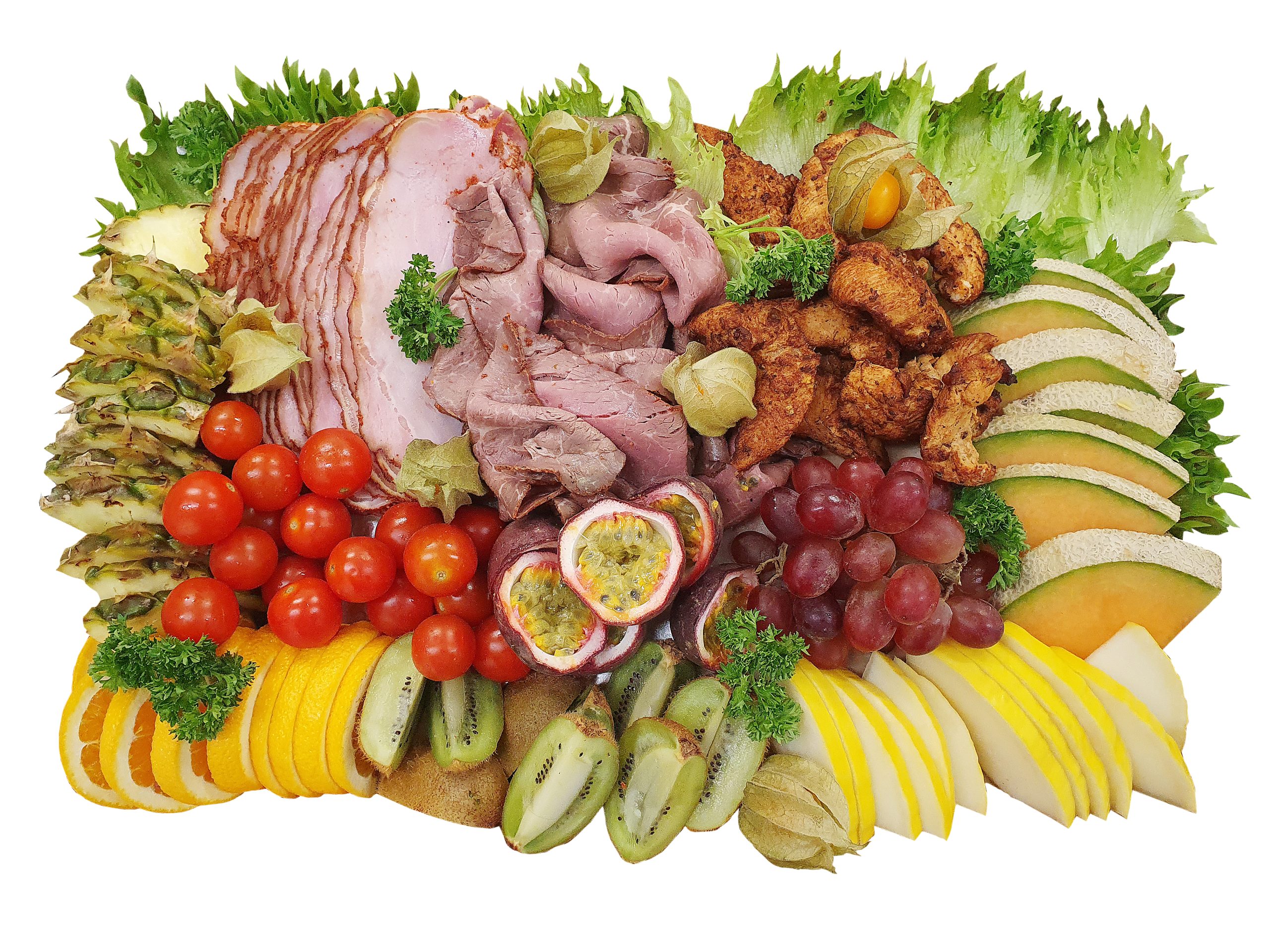 Bufféfat som består av Rostbiff, Pastrami samt Chilimarinerad kycklinginnerfilé , potatisfratäng, frukt/grönsaker: ananas, melon (cantaloup och honungs), coctailtomater, vindruvor, kiwi, sallad, passionsfrukt, apelsin, physalis samt persilja Pris per portion 159:-
